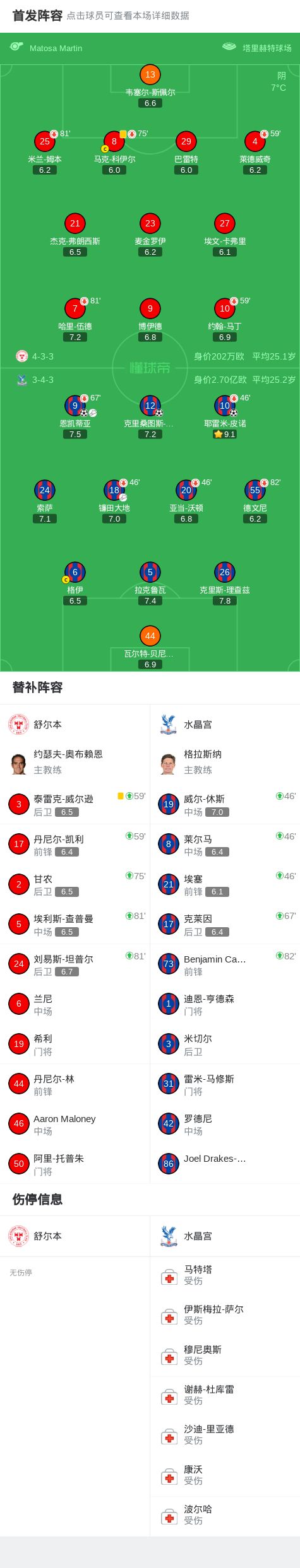 第38分钟,皮诺中路长驱直入破门,水晶宫3-0舒尔本